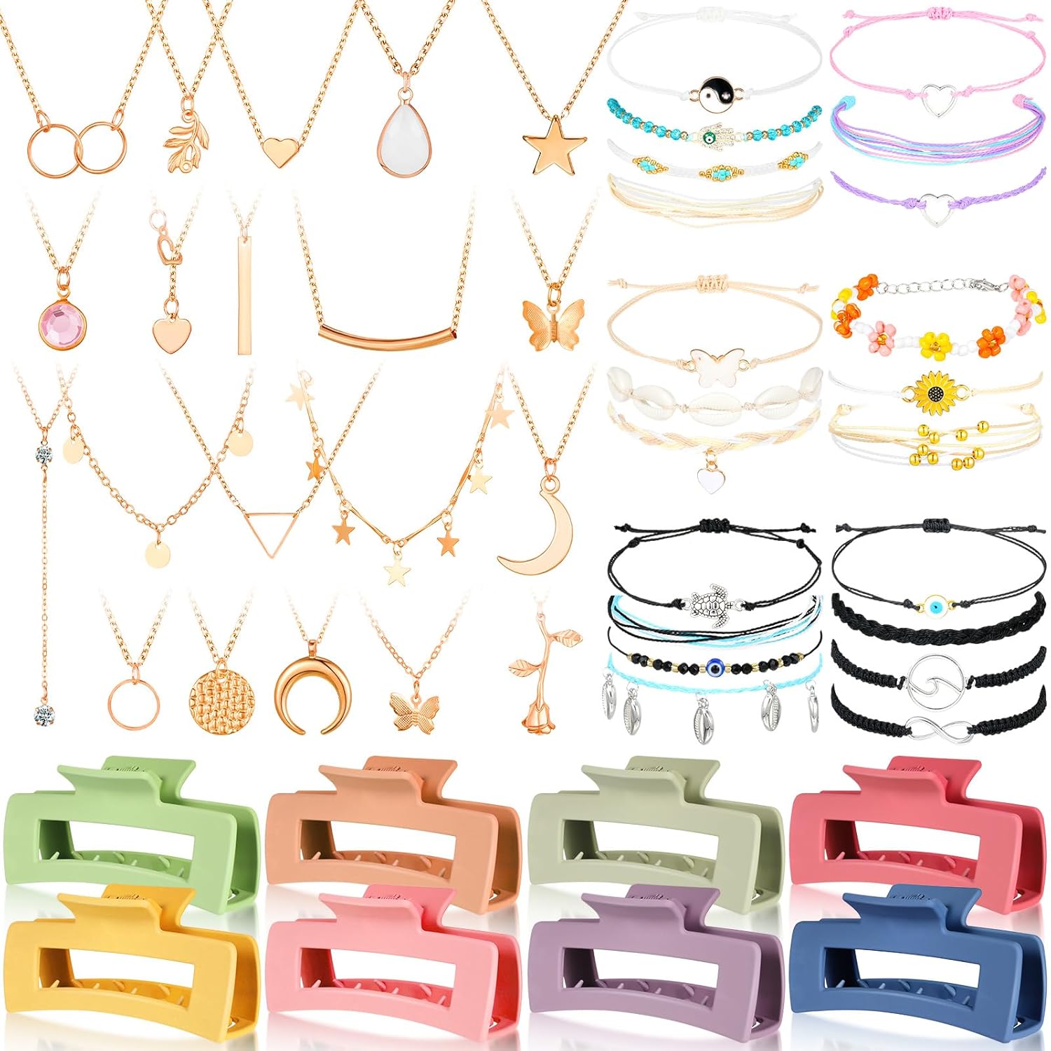 This set includes 20 layered necklaces, 21 summer bracelets, and 8 cute hair clips in various vibrant colors. Made of high-quality materials like alloy, acrylic, and stainless steel, these accessories are good for daily wear and can easily match any outfit.